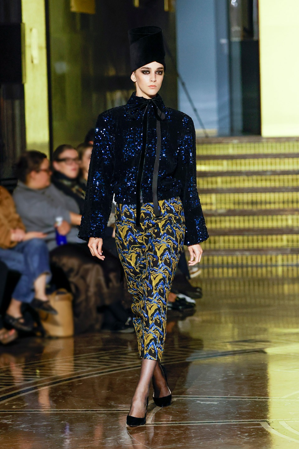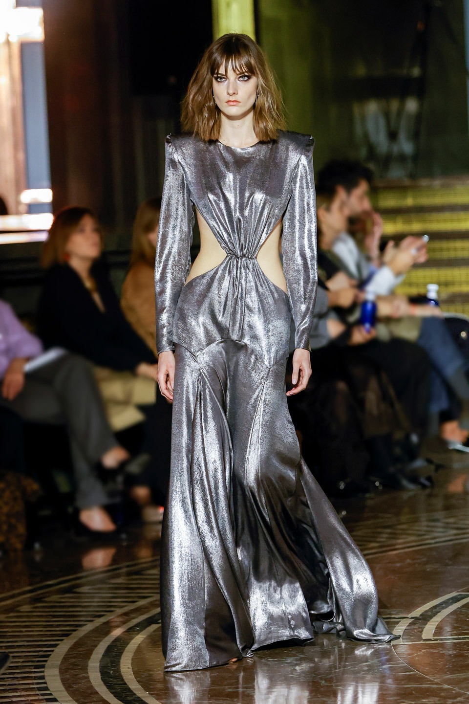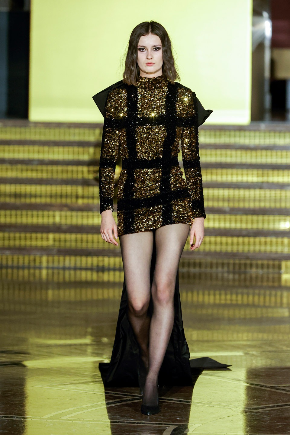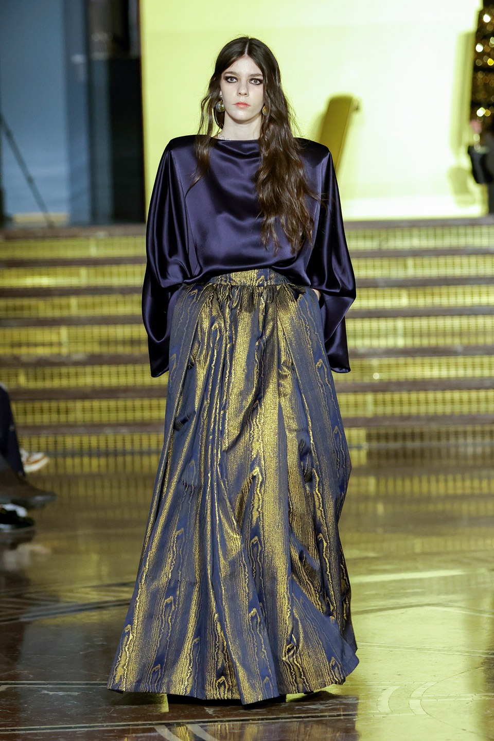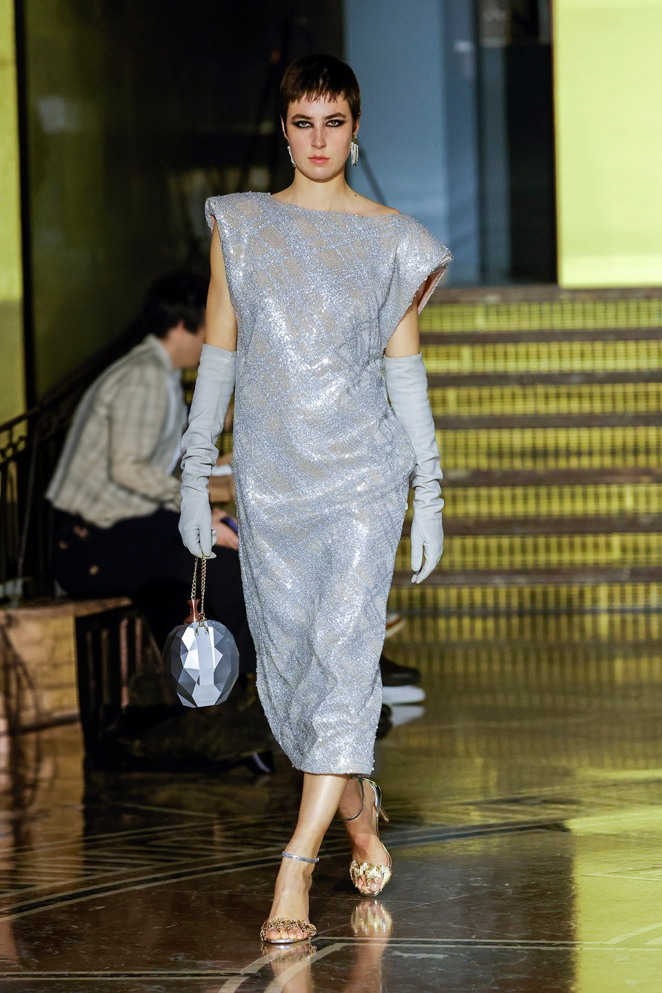 Siluetas estructuradas, hombros enfatizados, trajes de chaqueta, drapeados estratégicos, vestidos fluidos, lazadas arquitectónicas. Oro refulgente, azul eléctrico, magenta audaz, plata fulgurante, negro profundo. Jacquard, terciopelo, moiré, brocado, devoré, tafetán, tartán en pailletes y mostacillas bordadas… tejidos suntuosos para un uso contemporáneo.