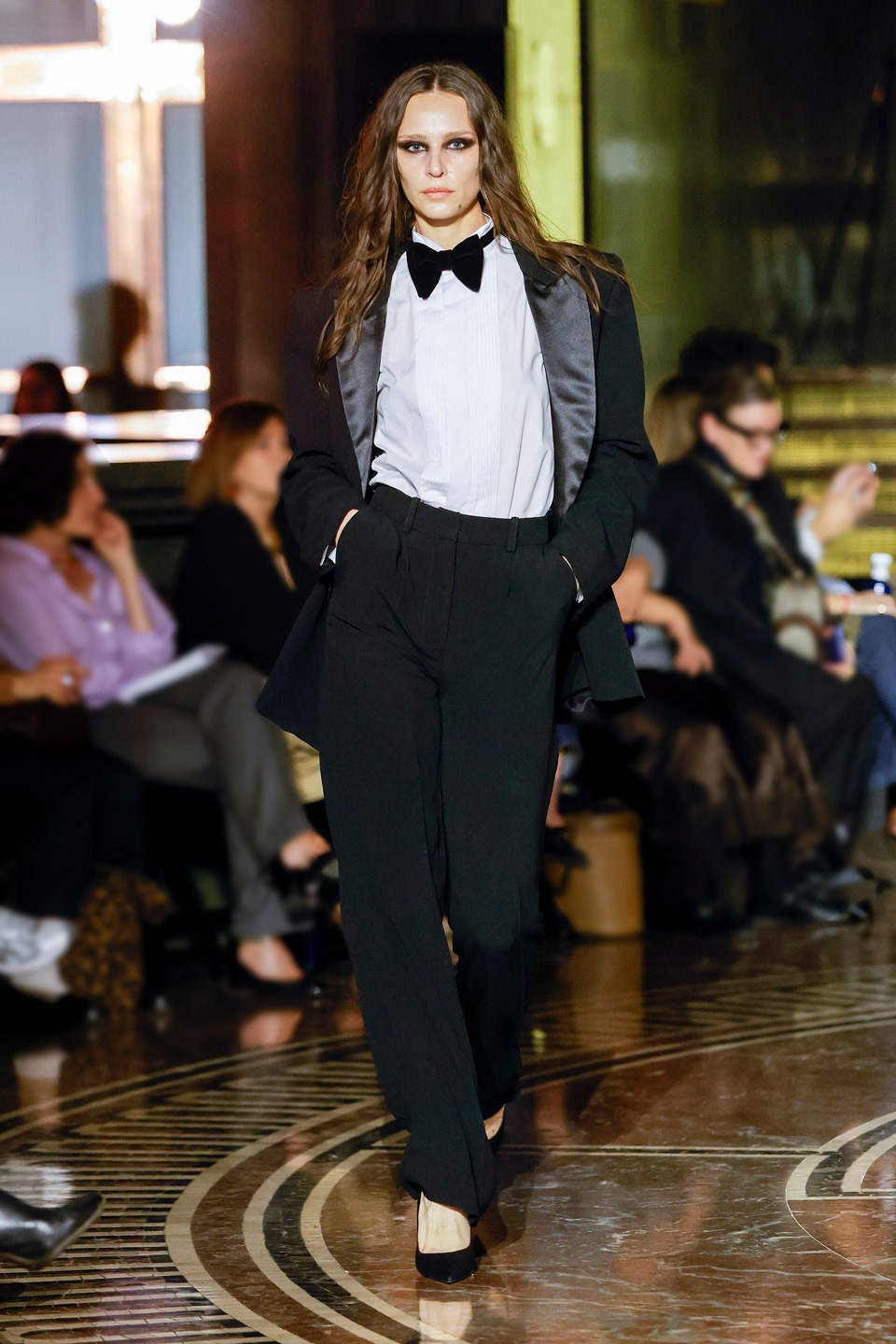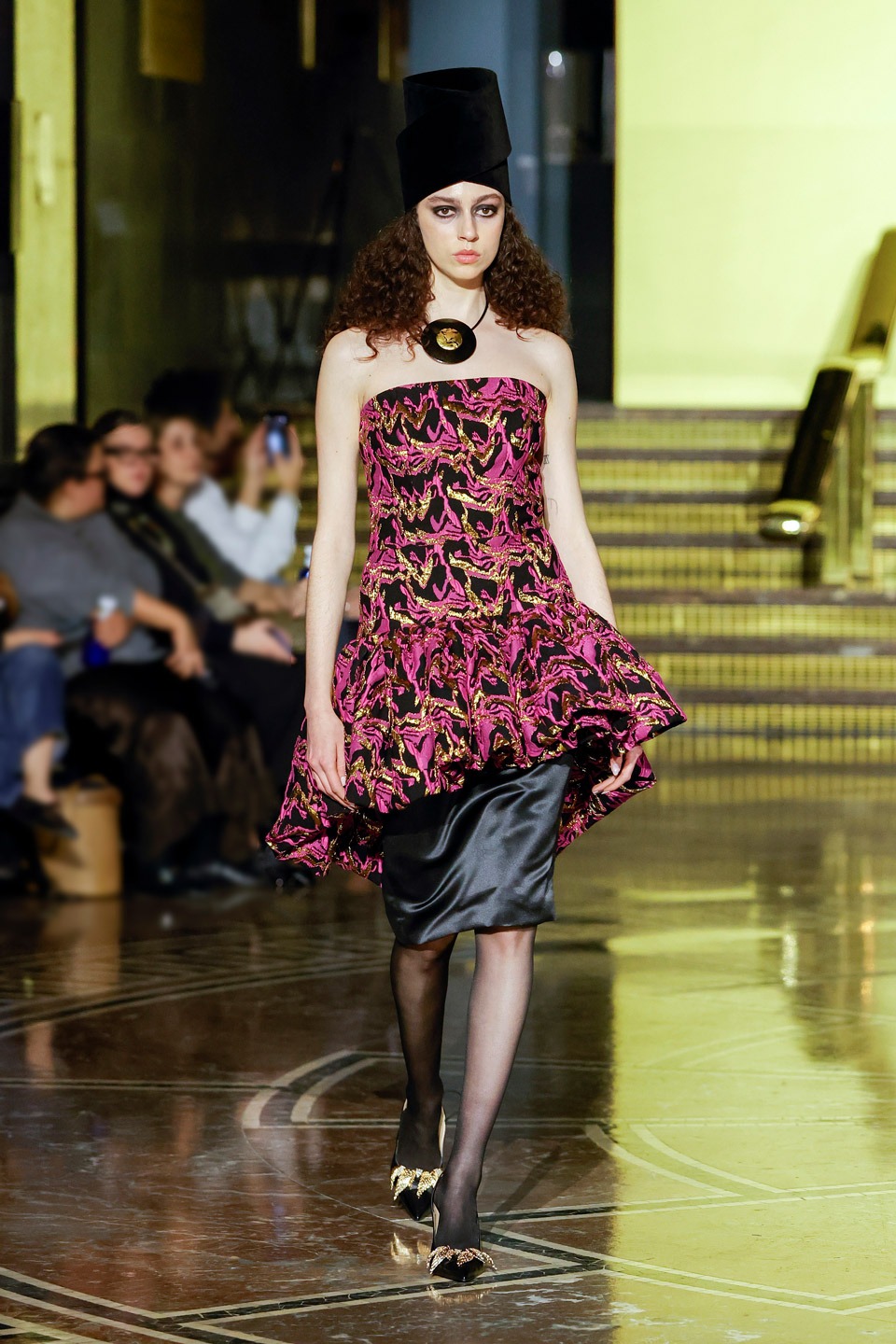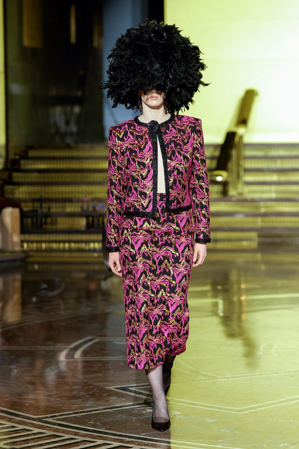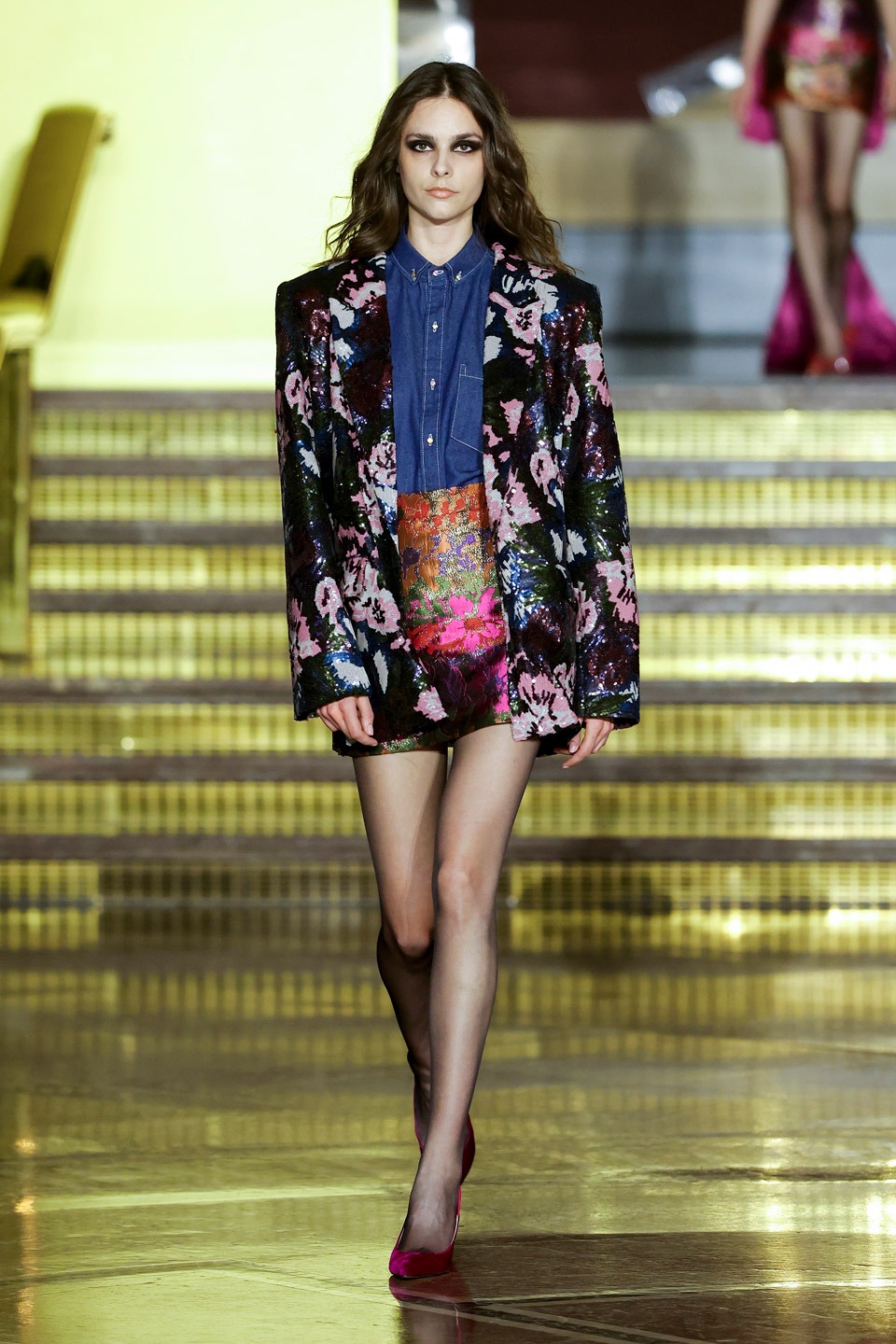 Siluetas estructuradas, hombros enfatizados, trajes de chaqueta, drapeados estratégicos, vestidos fluidos, lazadas arquitectónicas. Oro refulgente, azul eléctrico, magenta audaz, plata fulgurante, negro profundo. Jacquard, terciopelo, moiré, brocado, devoré, tafetán, tartán en pailletes y mostacillas bordadas… tejidos suntuosos para un uso contemporáneo.