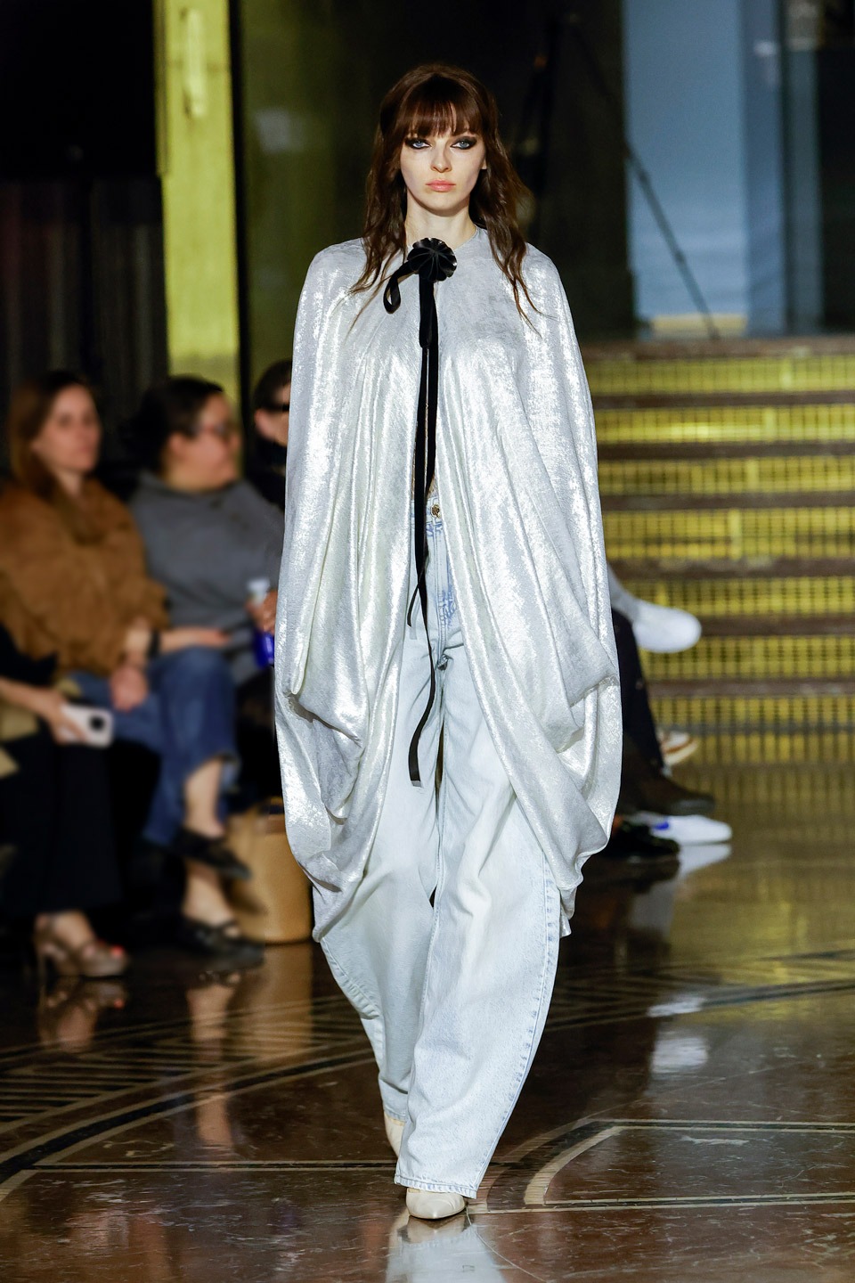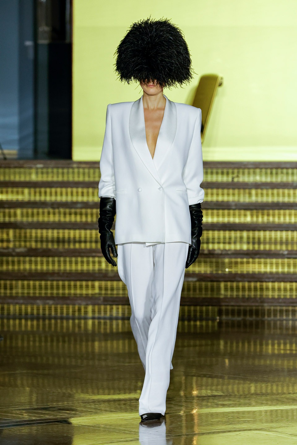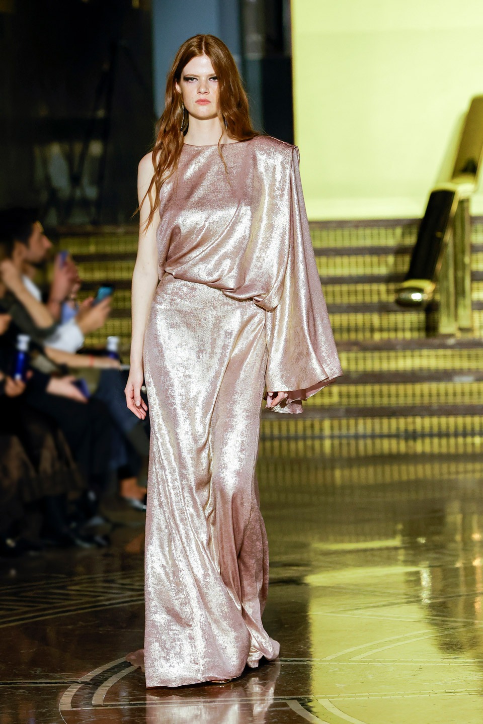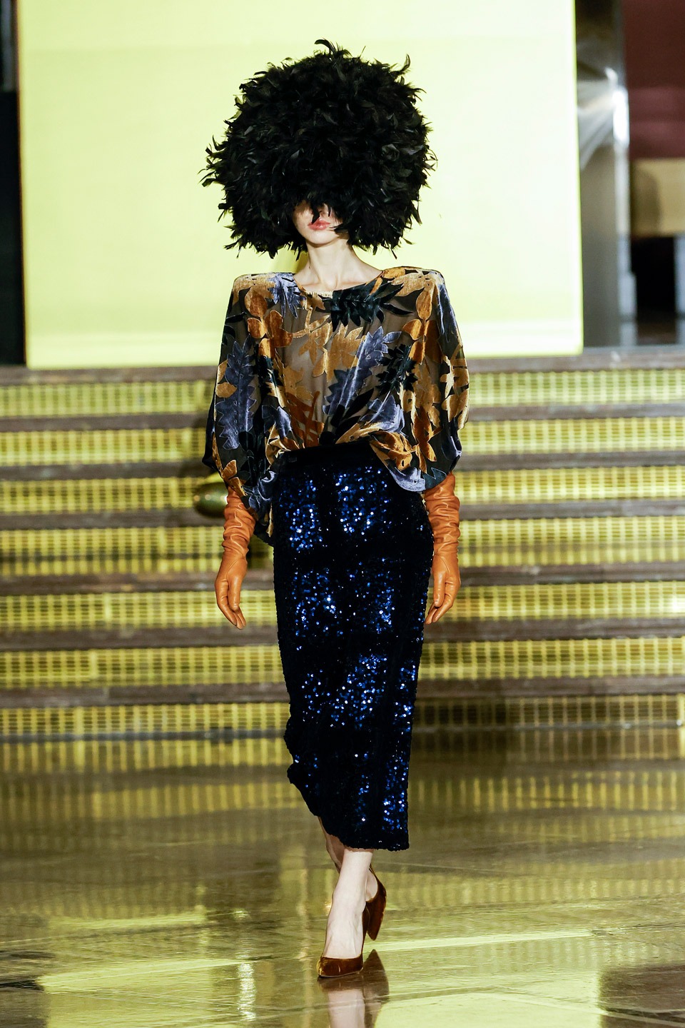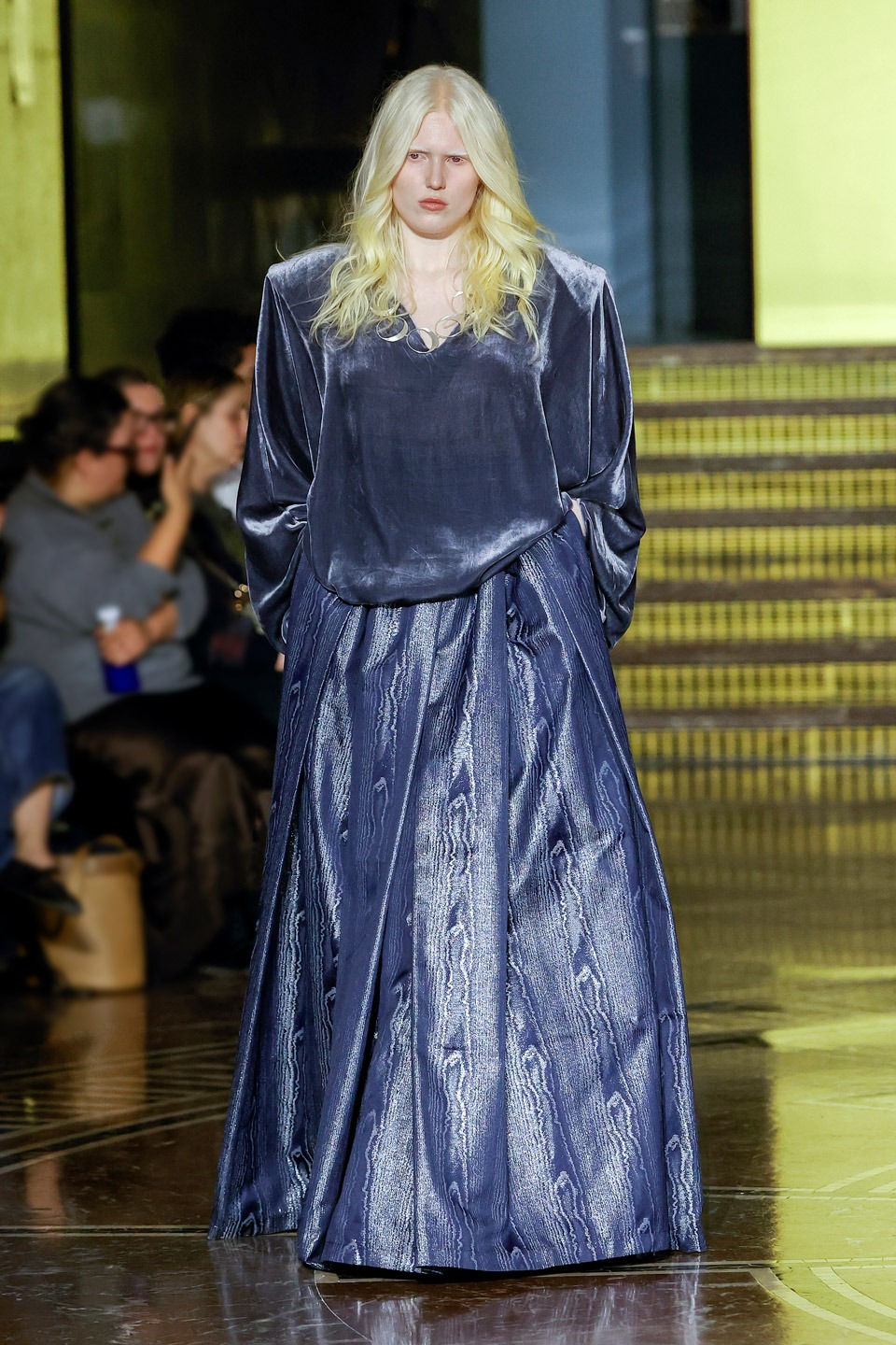 Siluetas estructuradas, hombros enfatizados, trajes de chaqueta, drapeados estratégicos, vestidos fluidos, lazadas arquitectónicas. Oro refulgente, azul eléctrico, magenta audaz, plata fulgurante, negro profundo. Jacquard, terciopelo, moiré, brocado, devoré, tafetán, tartán en pailletes y mostacillas bordadas… tejidos suntuosos para un uso contemporáneo.