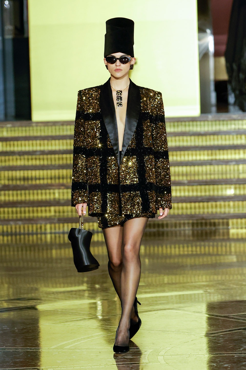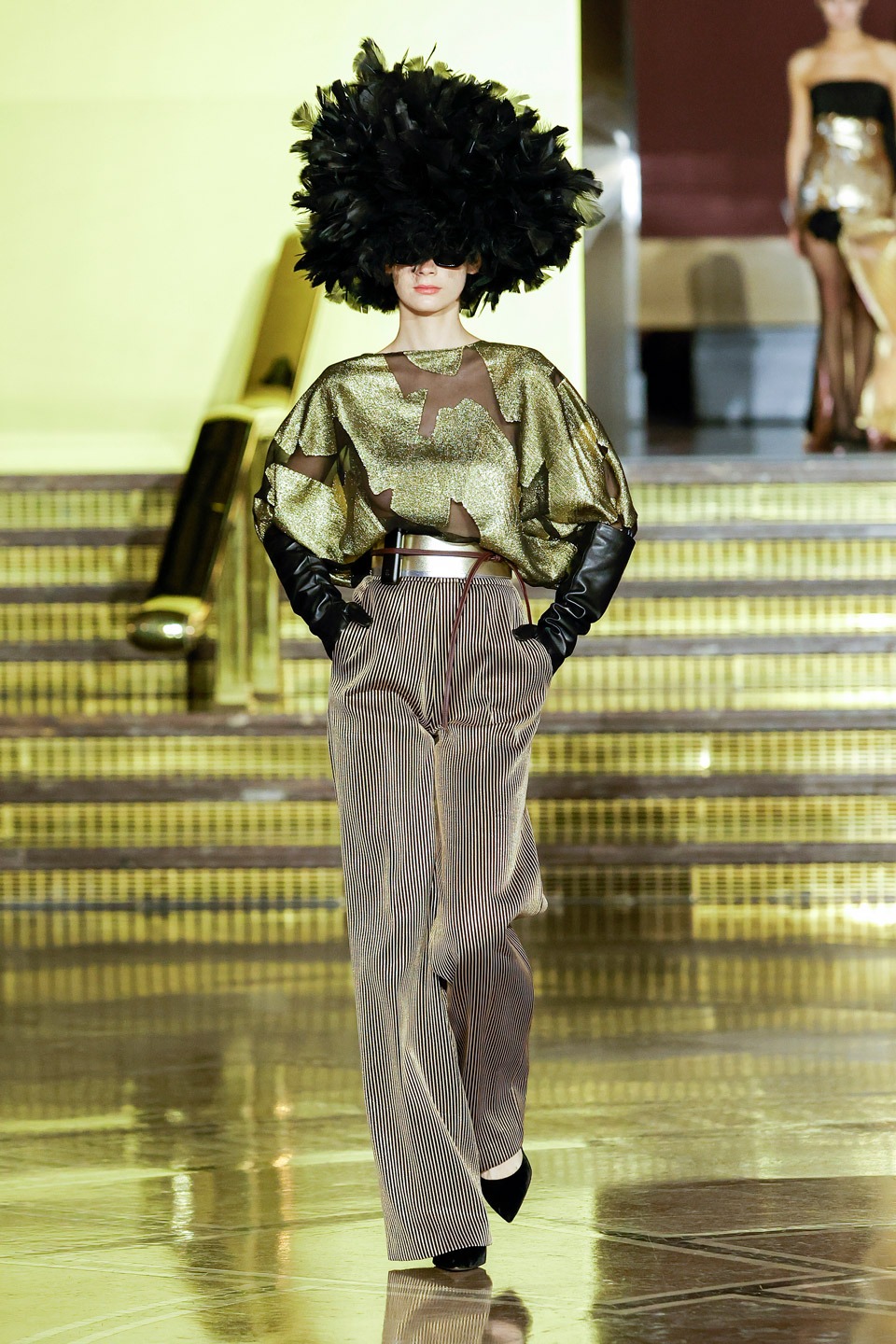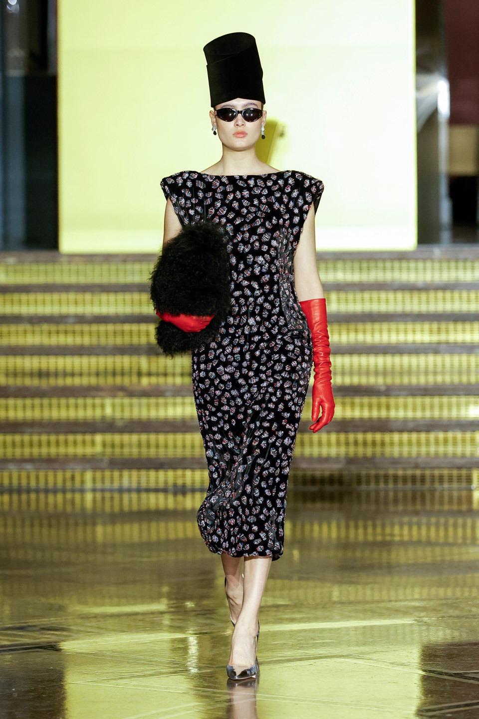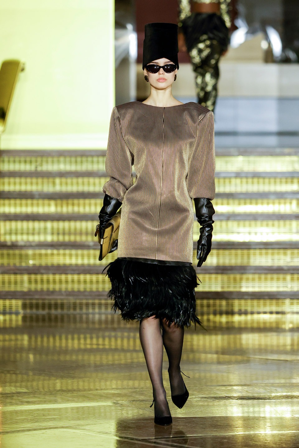 Siluetas estructuradas, hombros enfatizados, trajes de chaqueta, drapeados estratégicos, vestidos fluidos, lazadas arquitectónicas. Oro refulgente, azul eléctrico, magenta audaz, plata fulgurante, negro profundo. Jacquard, terciopelo, moiré, brocado, devoré, tafetán, tartán en pailletes y mostacillas bordadas… tejidos suntuosos para un uso contemporáneo.