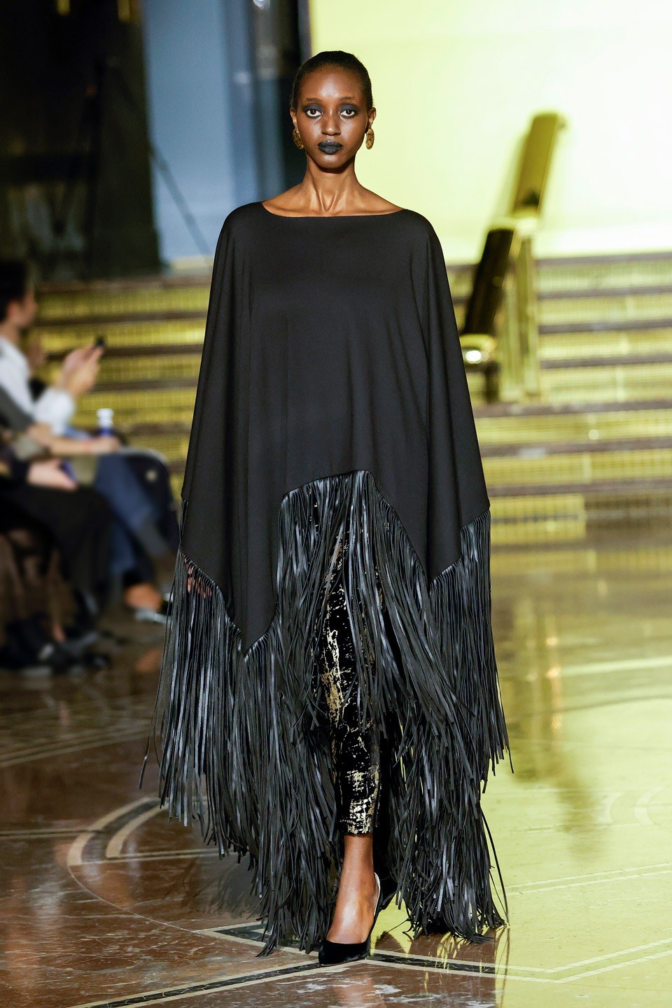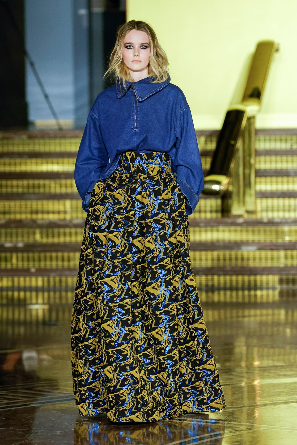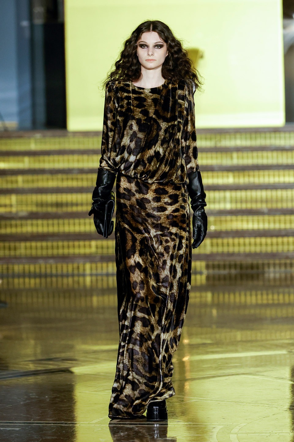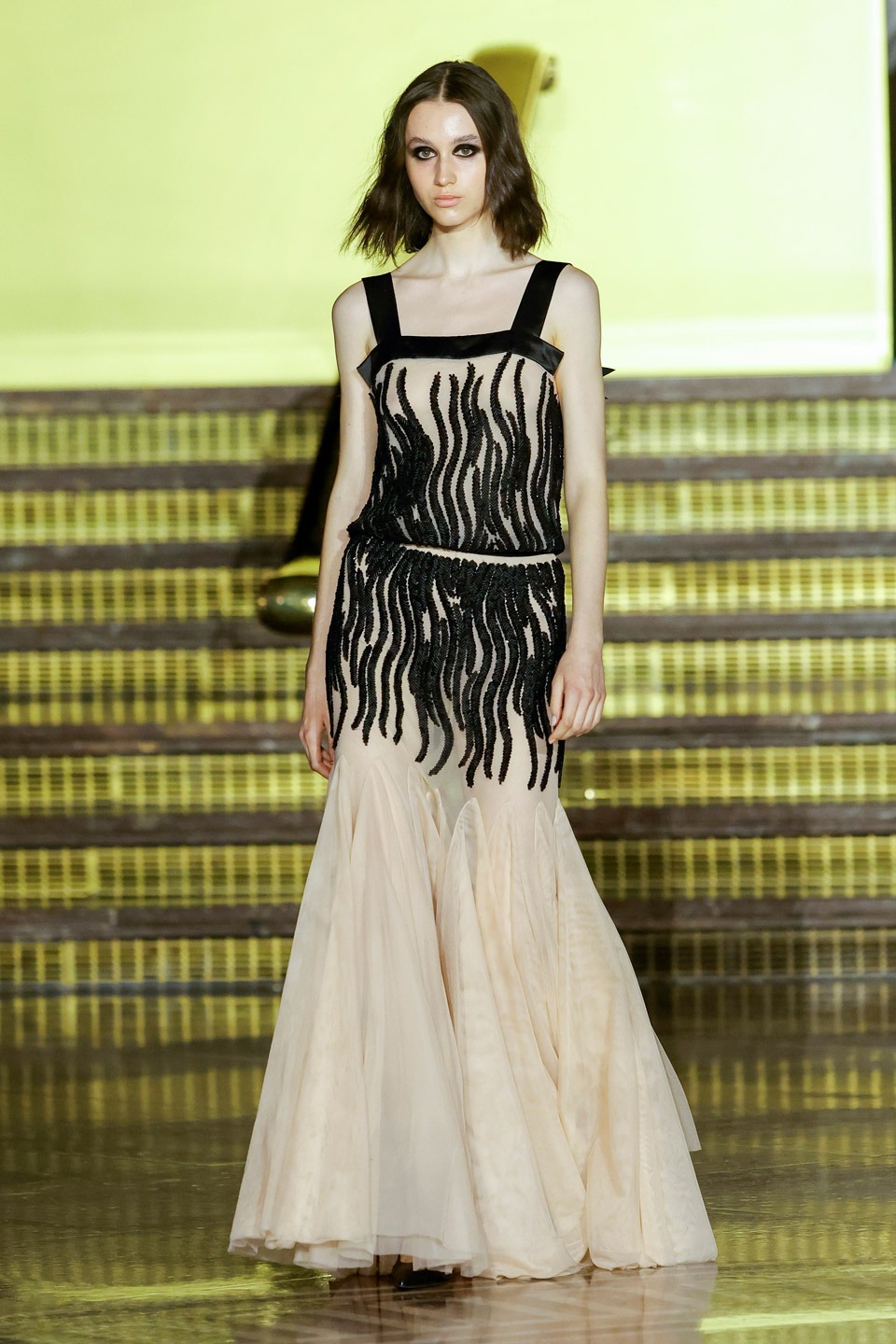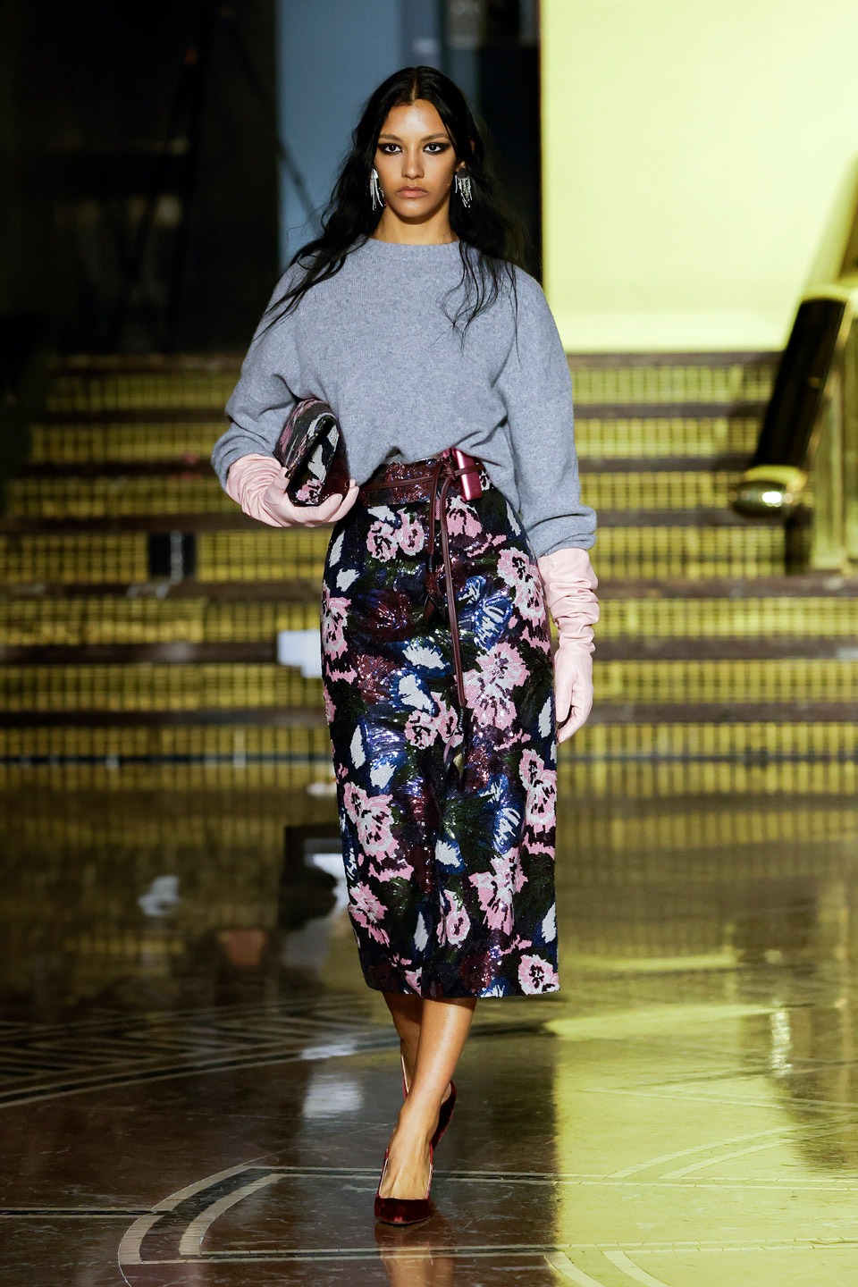 Siluetas estructuradas, hombros enfatizados, trajes de chaqueta, drapeados estratégicos, vestidos fluidos, lazadas arquitectónicas. Oro refulgente, azul eléctrico, magenta audaz, plata fulgurante, negro profundo. Jacquard, terciopelo, moiré, brocado, devoré, tafetán, tartán en pailletes y mostacillas bordadas… tejidos suntuosos para un uso contemporáneo.