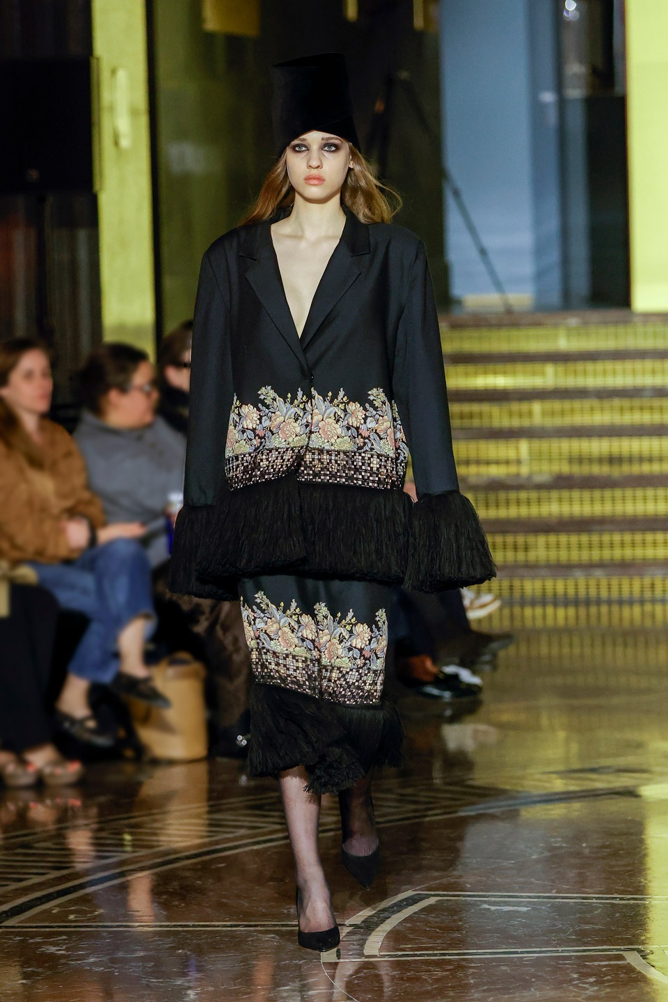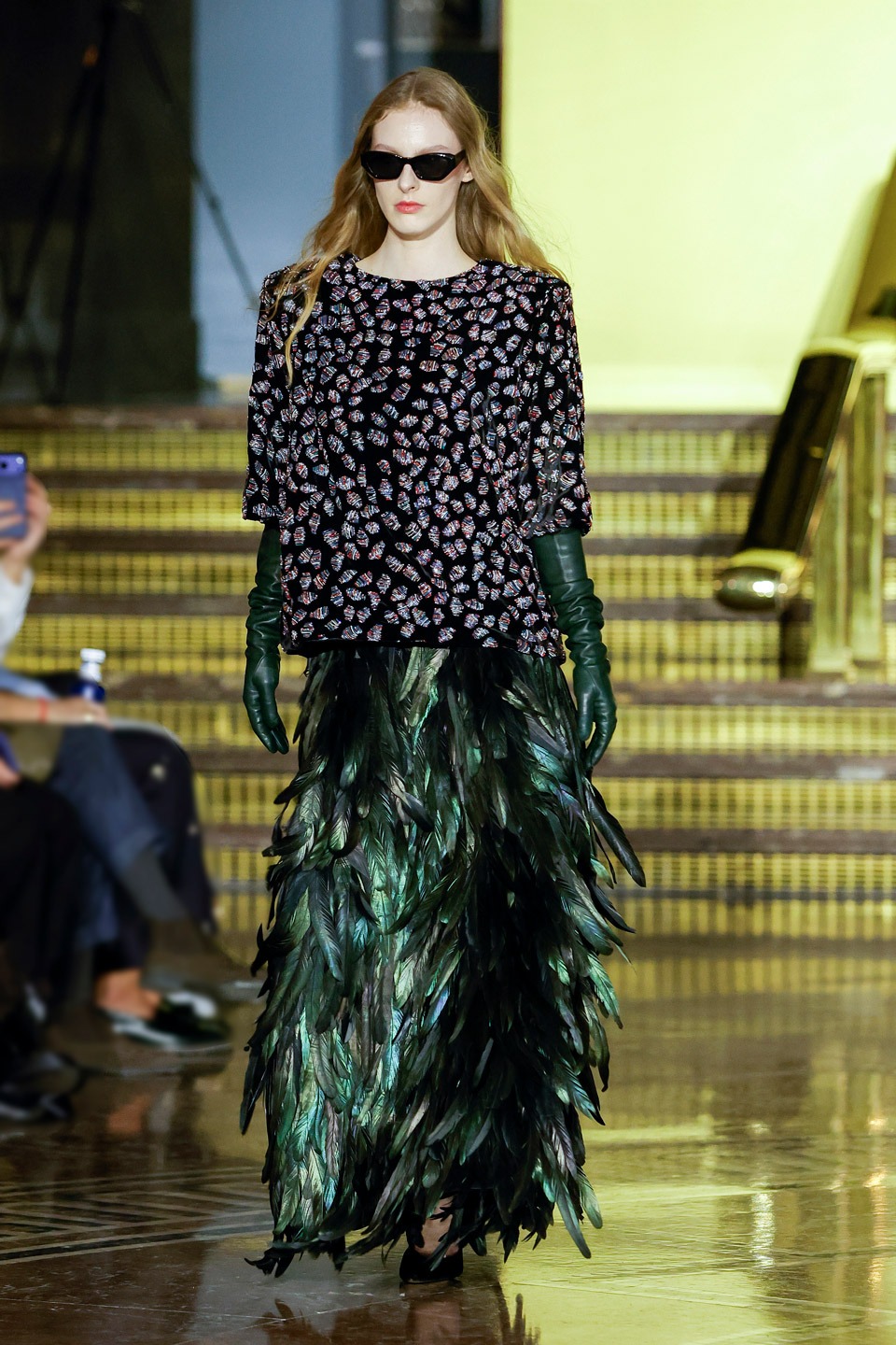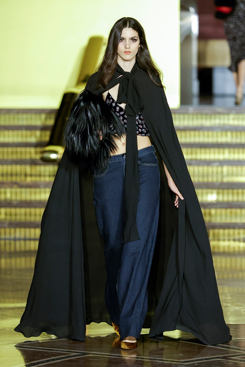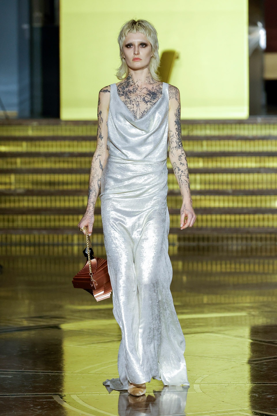 Siluetas estructuradas, hombros enfatizados, trajes de chaqueta, drapeados estratégicos, vestidos fluidos, lazadas arquitectónicas. Oro refulgente, azul eléctrico, magenta audaz, plata fulgurante, negro profundo. Jacquard, terciopelo, moiré, brocado, devoré, tafetán, tartán en pailletes y mostacillas bordadas… tejidos suntuosos para un uso contemporáneo.