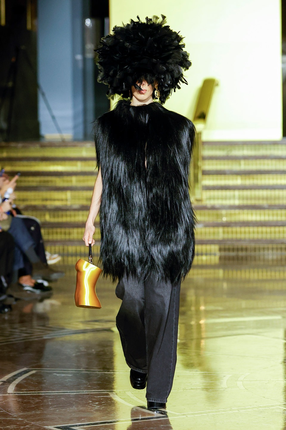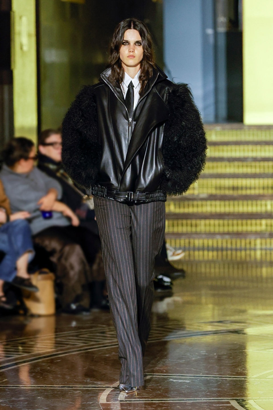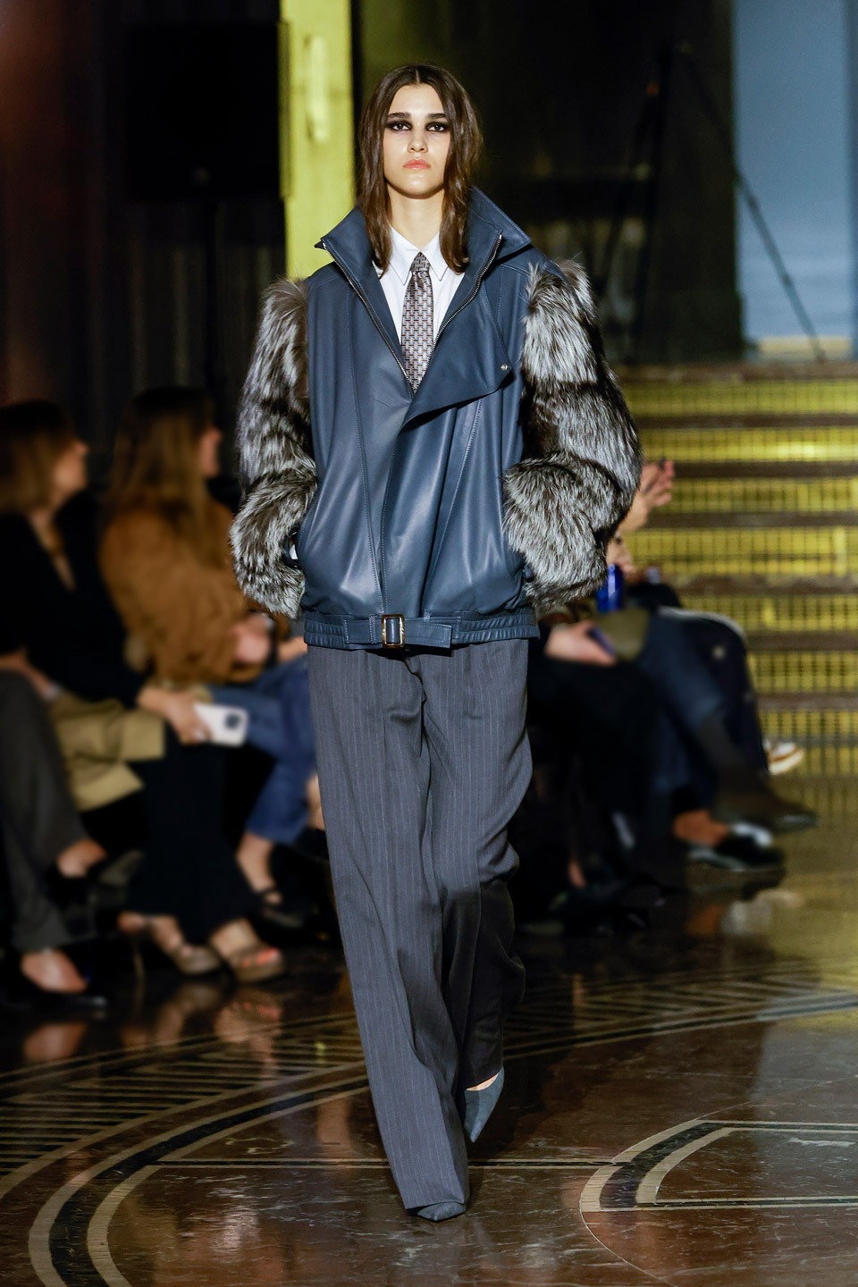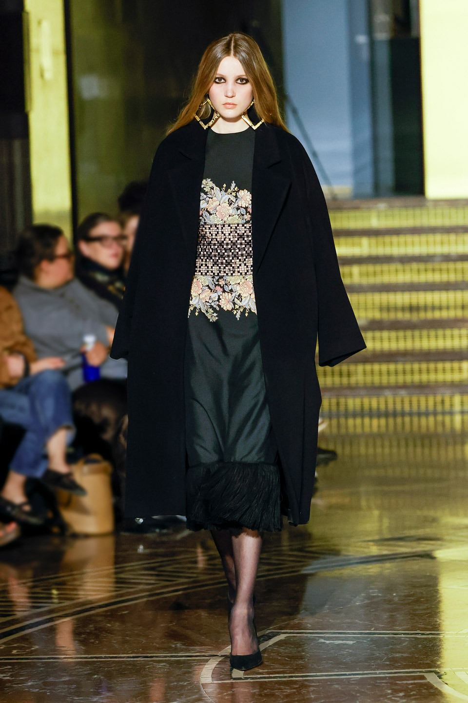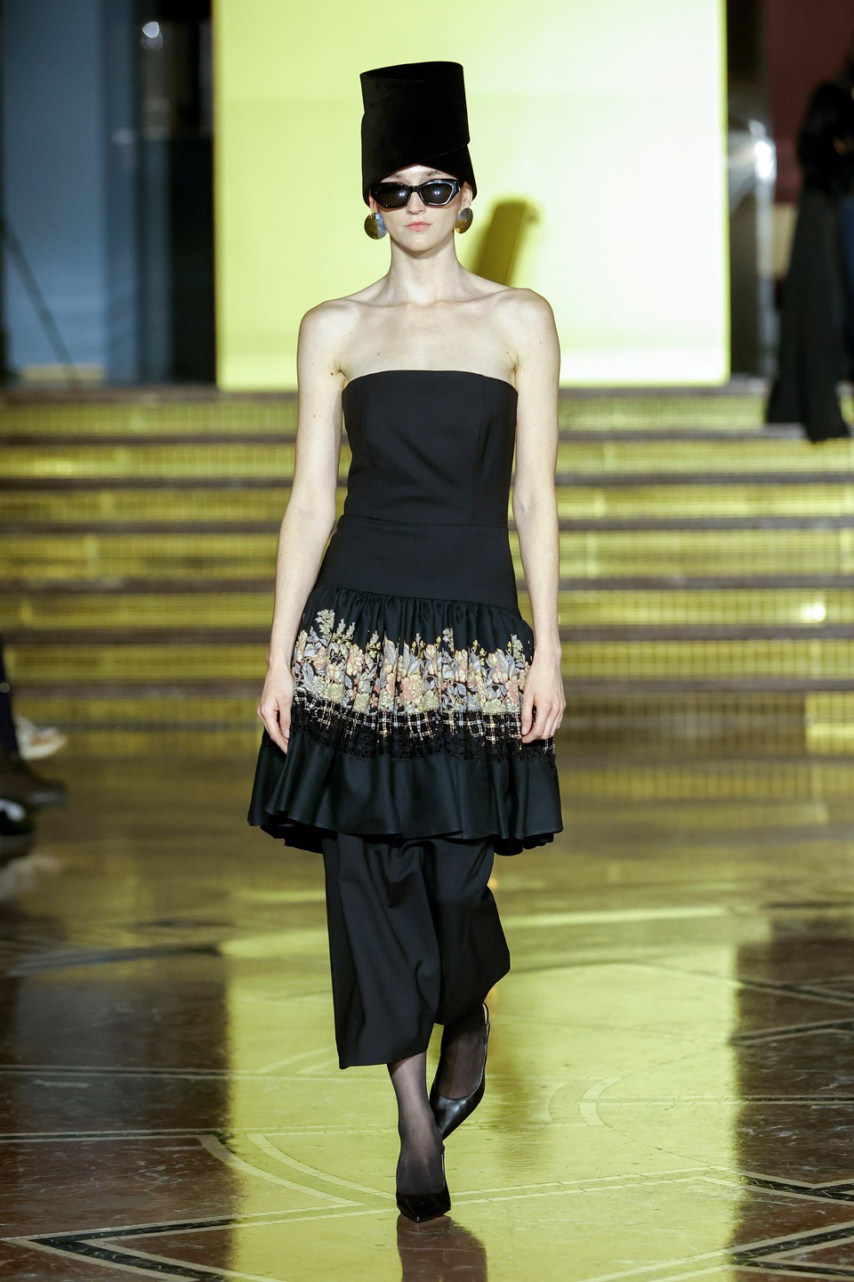 Siluetas estructuradas, hombros enfatizados, trajes de chaqueta, drapeados estratégicos, vestidos fluidos, lazadas arquitectónicas. Oro refulgente, azul eléctrico, magenta audaz, plata fulgurante, negro profundo. Jacquard, terciopelo, moiré, brocado, devoré, tafetán, tartán en pailletes y mostacillas bordadas… tejidos suntuosos para un uso contemporáneo.